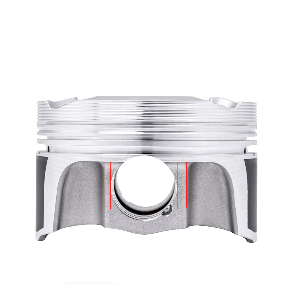 LSJ Note: These forged pistons will not work with the stock rectangular LSJ oil squirters. They must be replaced with the LNF/LDK tube type Gen 2 oil squirters. And, they need to be bent about .060" to the side to clear the JE pistons.