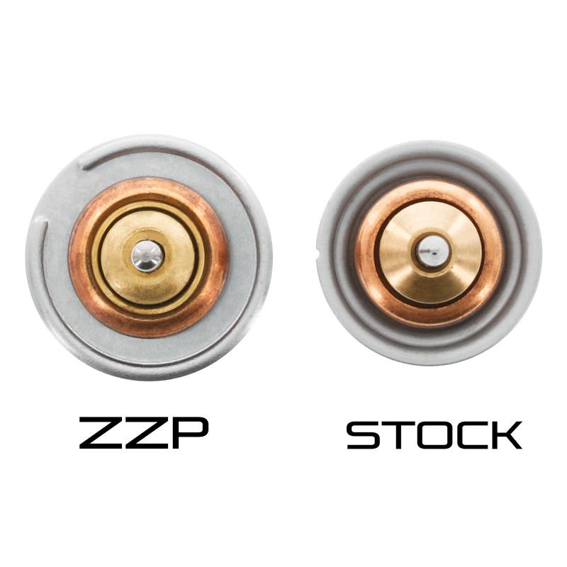 A non-drilled 180 stat is recommended for the 2004+ GPs, 2000+ Bonnevilles, Monte Carlos, Impalas and Regals or an engine code can be set. If you want to run a drilled or a 160 degree thermostat you may need to run our ZZP PCM because we have the ability to delete the 0128 code and to avoid a rich condition because the coolant temps are so low. The drilled thermostat will cause the engine to take longer to warm up, this is only beneficial in a situation when your car is sitting, not running, and is started up to race before the engine gets to temperature. For example, when in the staging lanes at the race track. Plus it flows a little bit of water even when the car is not to running temperature. The thermostat is still closed, so it frees up the parasitic loss of the water pump turning without the ability to move water. Since a drilled thermostat will take longer for your engine to warm up your gas mileage will also be reduced.