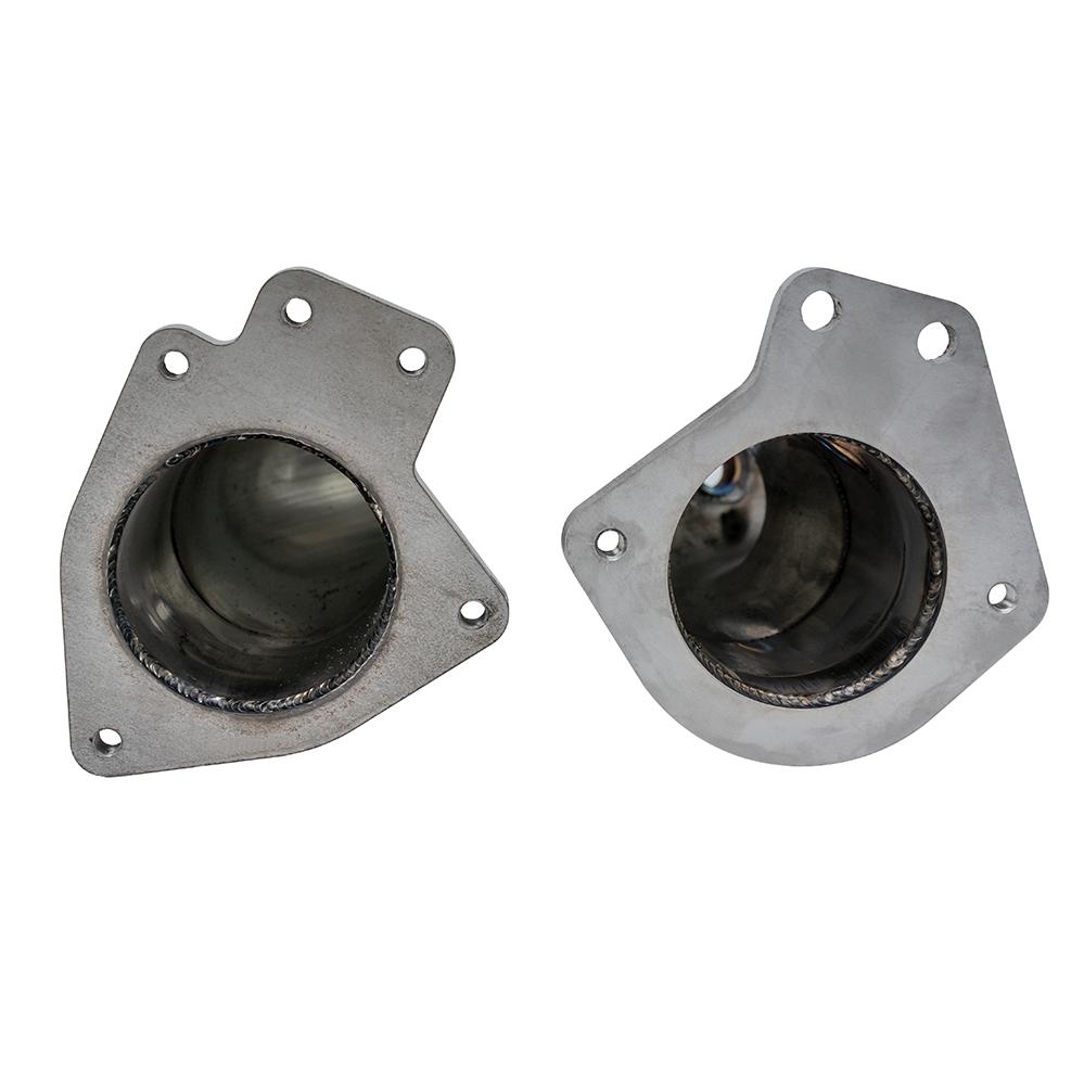 This o2 housing bolts directly to the turbo's outlet and then bolts to the factory downpipe. It is 3" in diameter, an o2 bung for your factory o2 sensor, and 100% stainless steel. The outlet flange is tapped just like the factory o2 housing for ease of install, you will not have to deal with trying to hold the bolt when tightening the nut in the tight engine bay.